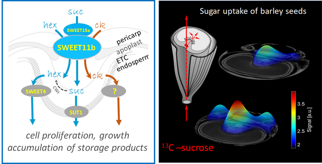 SWEET11b transports both sugar and cytokinin in developing barley grains. Plant Cell 35 (2023) 2186-2207. https://dx.doi.org/10.1093/plcell/koad055